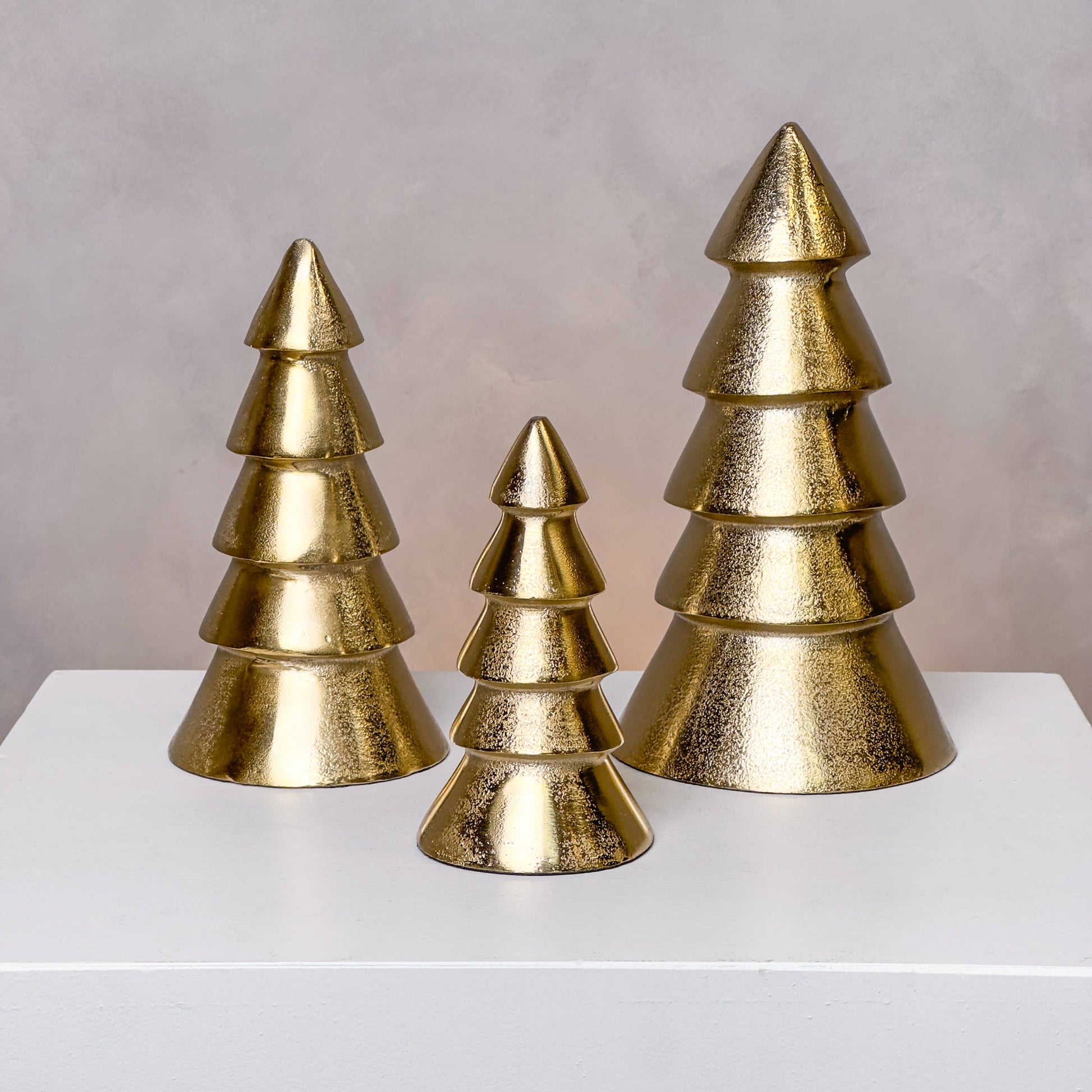Set of three gold, metal Christmas Trees. Perfect for an anchor to your tablescape.