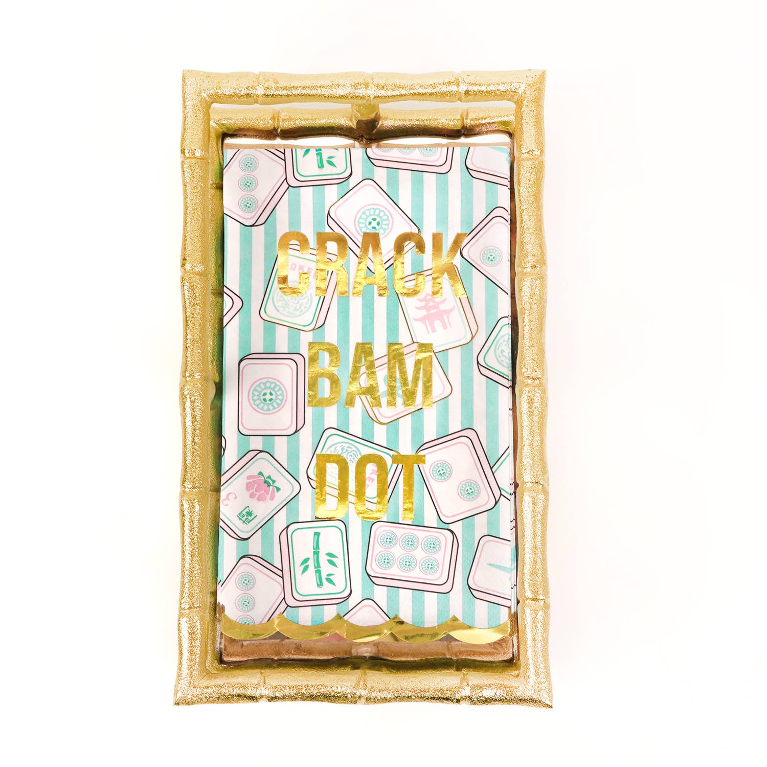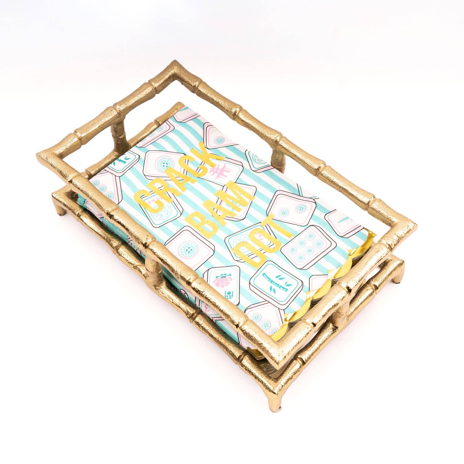Crack! Bam! Dot! Elevate your next afternoon game of Mahjong with these bright & fun Mahjong Stripe Paper Guest Towel Packs. Perfect for any table, bathroom, or bar cart, these gorgeous towels will surely be the talk of the night. Crafted with gold-colored scalloped edges and mahjong tile striped print each package includes sixteen single-use paper towels that deliver a dose of luxury to any gathering. With a stylish rattan or bamboo guest towel tray, it makes the ideal present for any special occasion. These towels will delight your guests while they relax and enjoy their evening. Make sure your game night is one to remember by adding these delightful Mahjong Stripe Paper Guest Towel Packs – designed in the USA and imported from abroad – to all of your get-togethers!